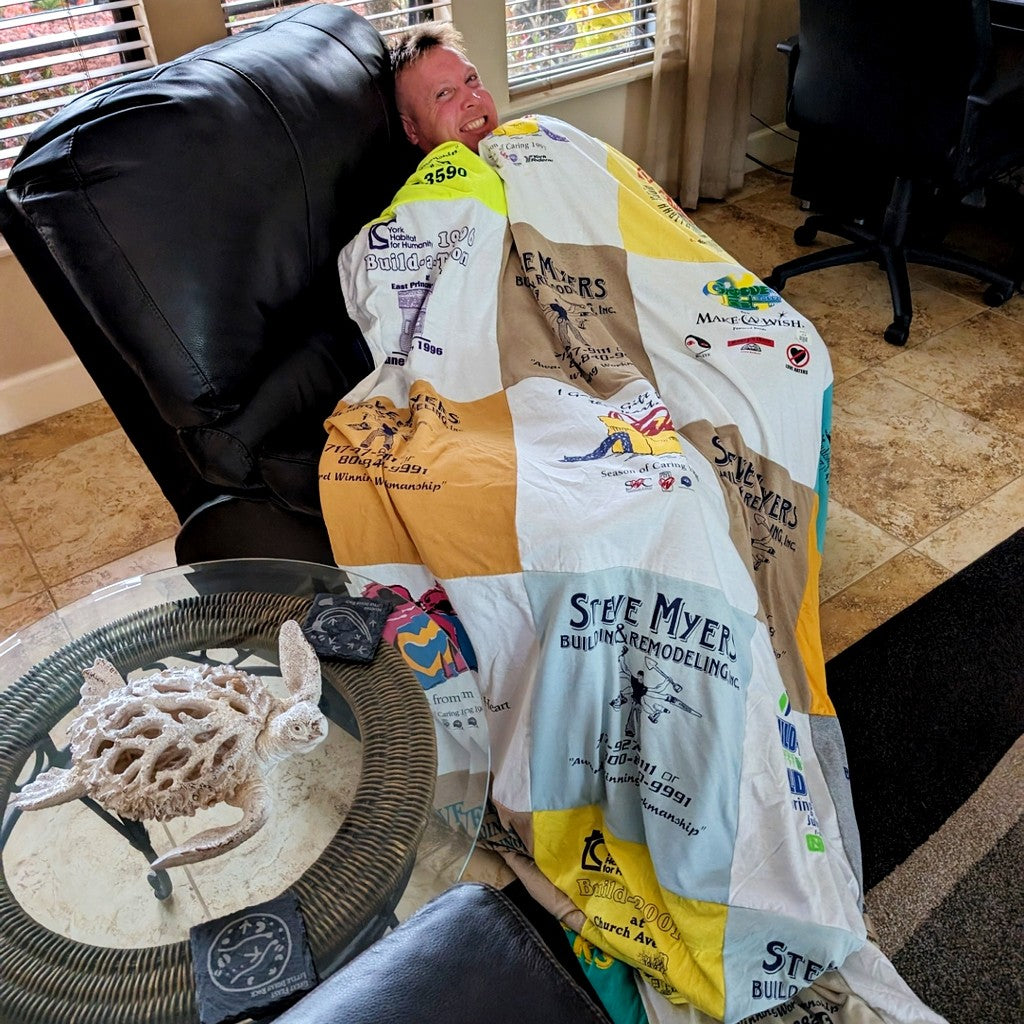 My husband passed in July. I gathered his old well worn tee shirts and the blanket you produced has given me so much comfort and renewed so many great memories. My kids are all amazed at how well crafted it is. I sleep with this blanket every night. Thank You.