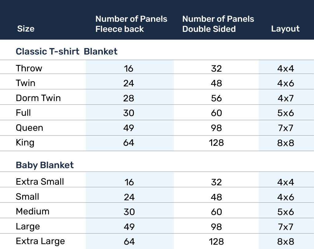 For our Classic T-Shirt Blankets, we offer four larger panel sizes: